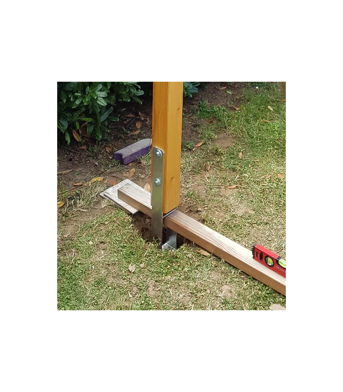Laissez la patte du haut au-dessus du trou. Pour cela, utilisez un bois d'environ 3cm d'épaisseur que vous positionnez par-dessus le trou et sous la patte métallique. Vérifiez son horizontalité, puis vérifiez la verticalité de l'ancre. Comblez le trou avec de la terre et des cailloux ou avec un béton à prise rapide