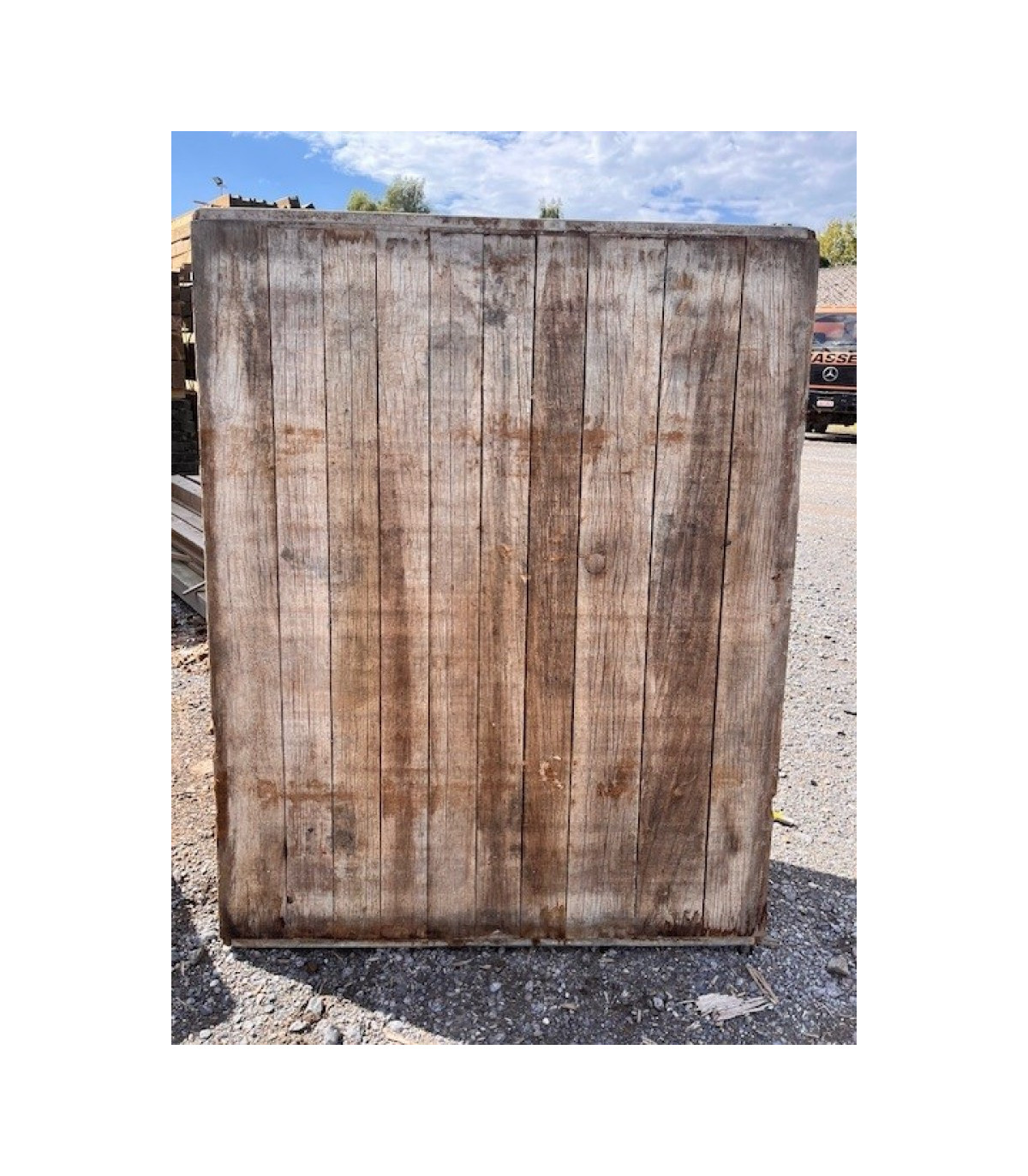 Panneau en bois dur de second choix, présentant des traces d'utilisation qu'il est possible d'atténuer par un lavage, un brossage et un ponçage des panneaux. Hauteur de 100 ou 110cm en fonction des arrivages.